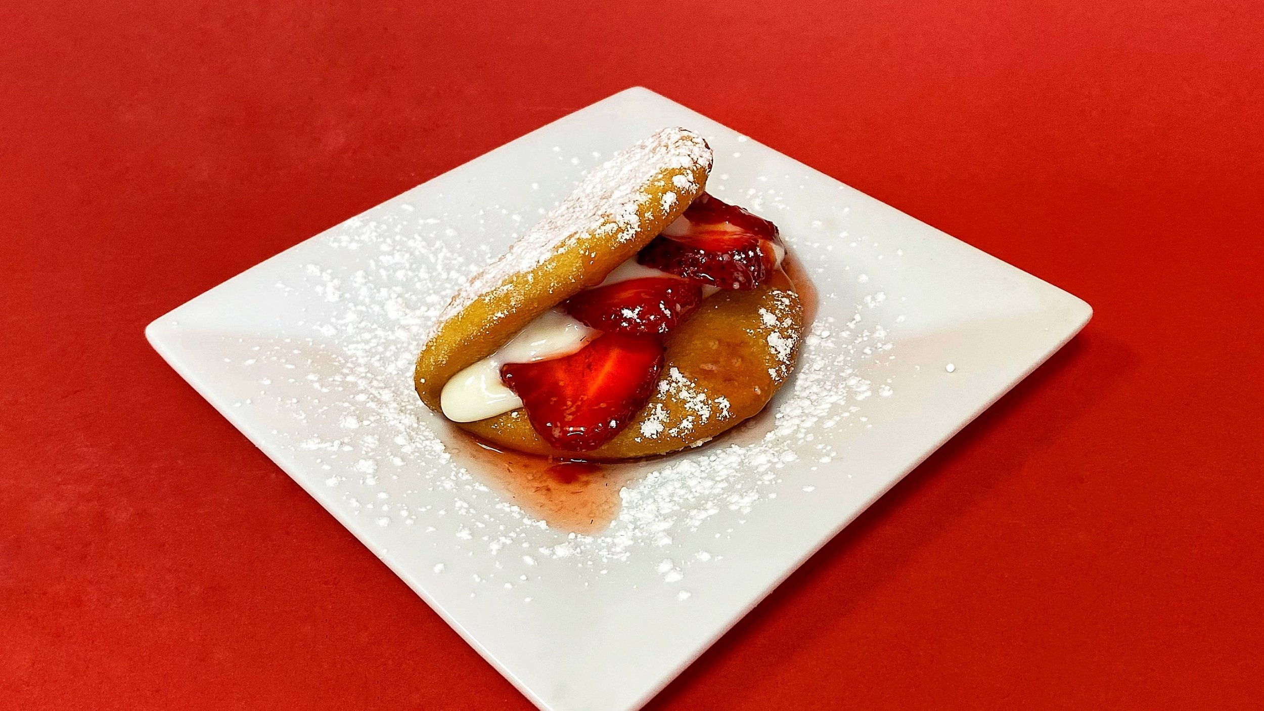 Deep-fried bao with sweet cream cheese filling, topped with fresh strawberries and sauce, sprinkled with powdered sugar.